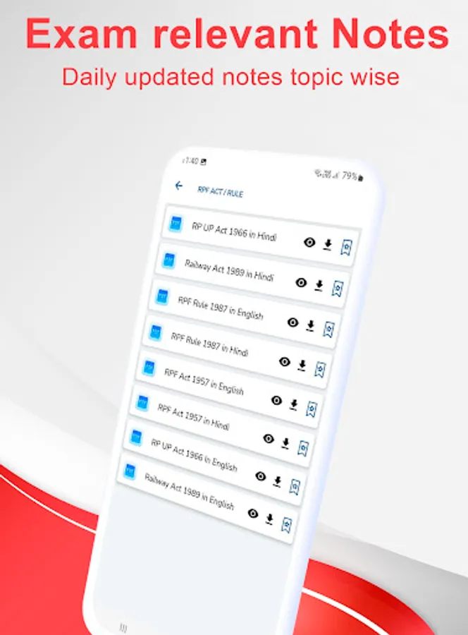 This app contains Study material, One liners, Test Series and Previous Paper for Railway RPF exam. Students are advised to start to prepare from now on to achieve success in RPF exam.