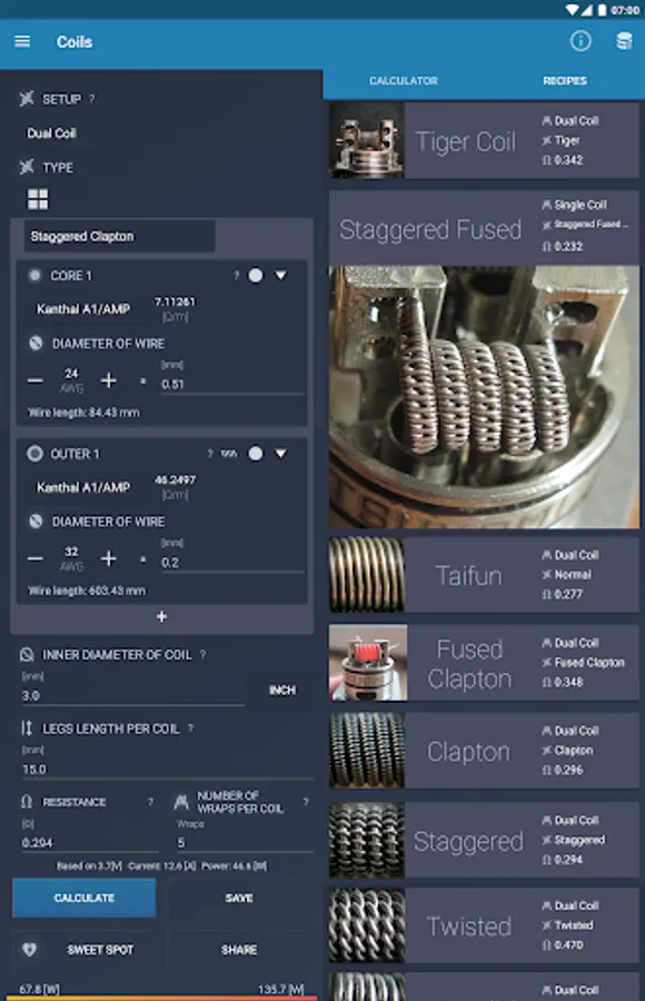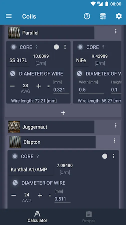 Coil Calculator/Coil Wrapping: help you calculate perfect coils, number for wraps or resistance based on wraps ! Works similar to Steam Engine it support multi-coil setups, types like Clapton Coil, Parallel Coil, Twisted Coil, Ribbon Wire and diffrent wire materials
