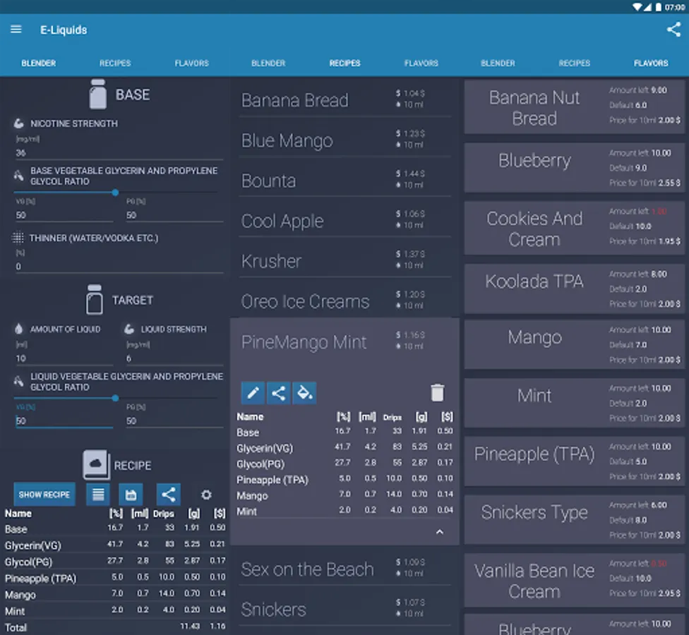 Liquid Blender Calculator: will help you make and calculate e-liquids and calculate thier final cost. You can save recipes and share with your friends.