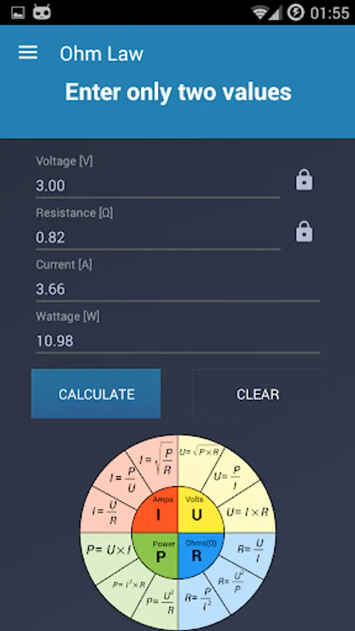 Ohm Law calculator: based on ohm law, you will be able to calculate Voltage [V], Resistance [Ω], Current [A], Power [W]