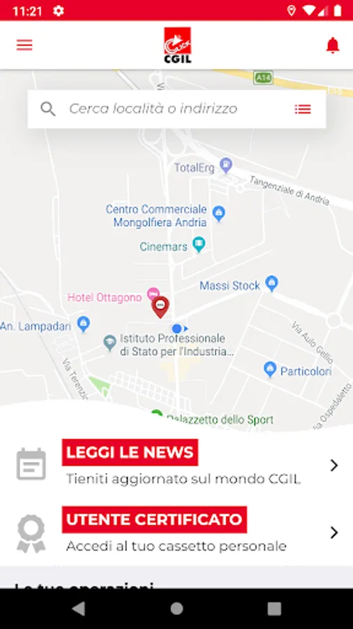 Download Click CGIL, start it and you will be geolocalized on a map where the CGIL offices closest to you will appear with the symbol (red color position).