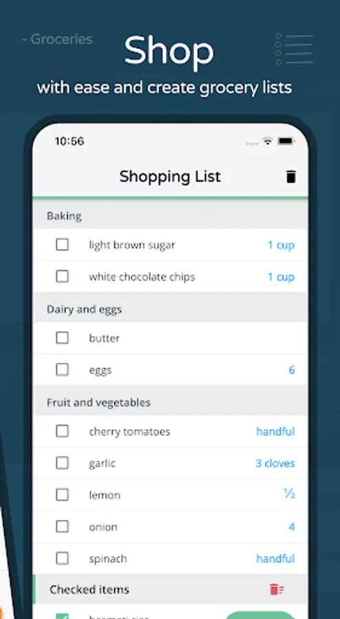 Simplify shopping grocery! Add all the ingredients from any of your recipes. Then manually add any other items you need and let Stashcook organize them by supermarket aisle. Never again will you forget the milk!