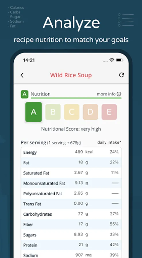 Get in-depth analysis for any of your stashed recipes. Also, find out which ingredients contribute the most to Calories, Proteins, Carbohydrates, Fats, Sugars and Sodium so you can take control of your diet and plan your food to fit your goals.