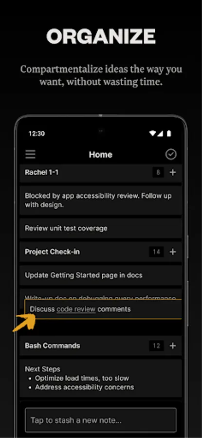 Stashpad is the note-taking app designed for your working memory. Get your thoughts out, organize them effortlessly, and return to them when you’re ready.