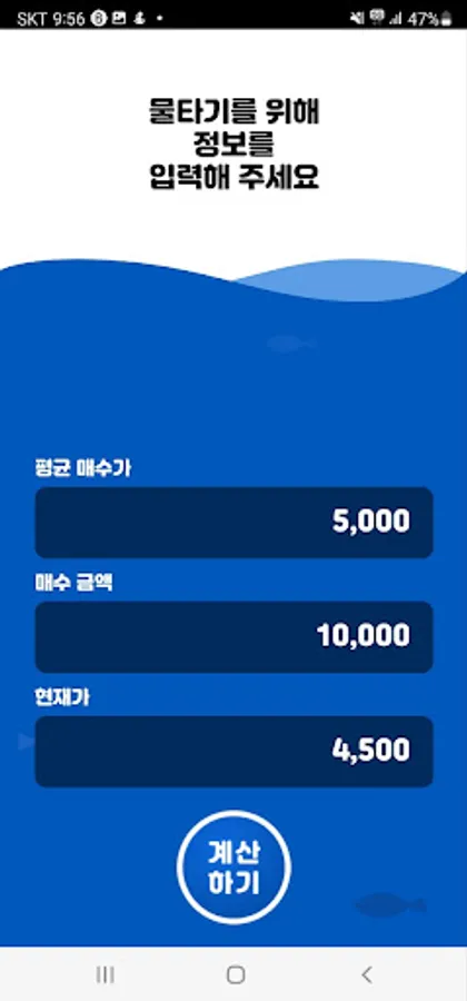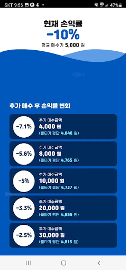 If you input the average purchase price, purchase amount, and current price, it automatically calculates the current profit and loss ratio and the average purchase price through a certain amount of water.