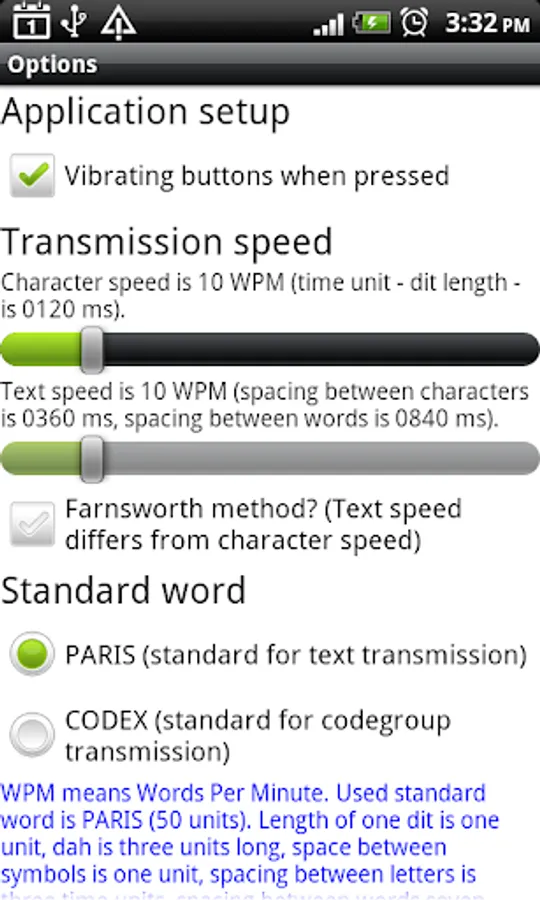 - configurable speed of sound output in words per minute. Farnsworth timing of morse code transmission is supported, CODEX/PARIS standard word supported