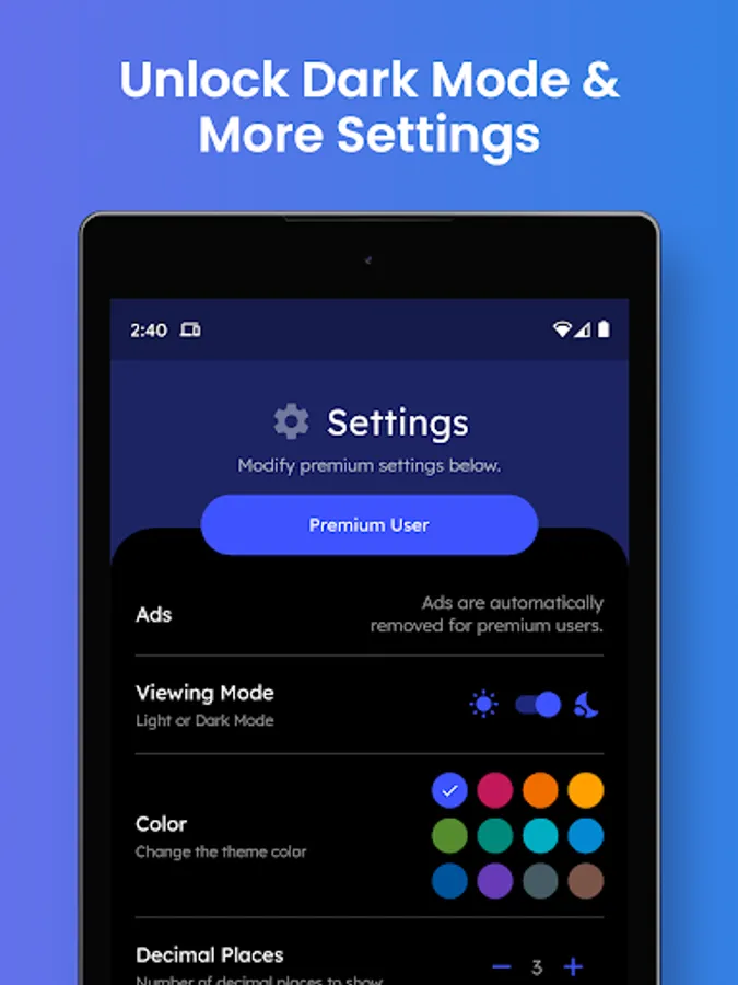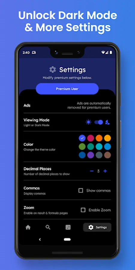 • Dark Mode • 12 Color Themes • Zoom • Custom Decimal Precision • Comma Display • No Ads