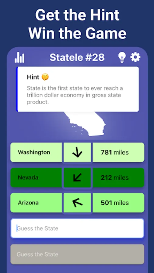 Statele is geographical Wordle which is a Worldle and this time you have to guess the U.S states in 6 guesses globle! Statele - word game - is a free word puzzle with a twist. Statele is a geoguess (geo challenge) quiz game that gives you a state outline, direction, and distance to find the state.