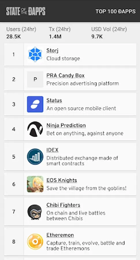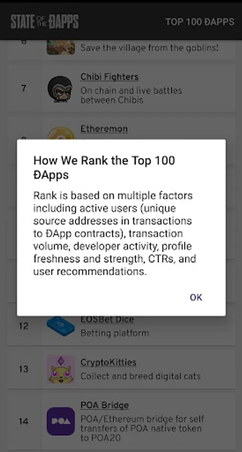 Using this app, you can see the TOP 100 ÐApp list, ranked by multiple factors including active users (unique source addresses in transactions to ÐApp smart contracts), transaction volume, developer activity, profile freshness and strength, CTRs, and user recommendations.