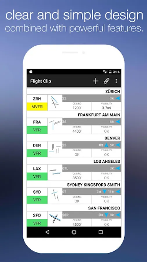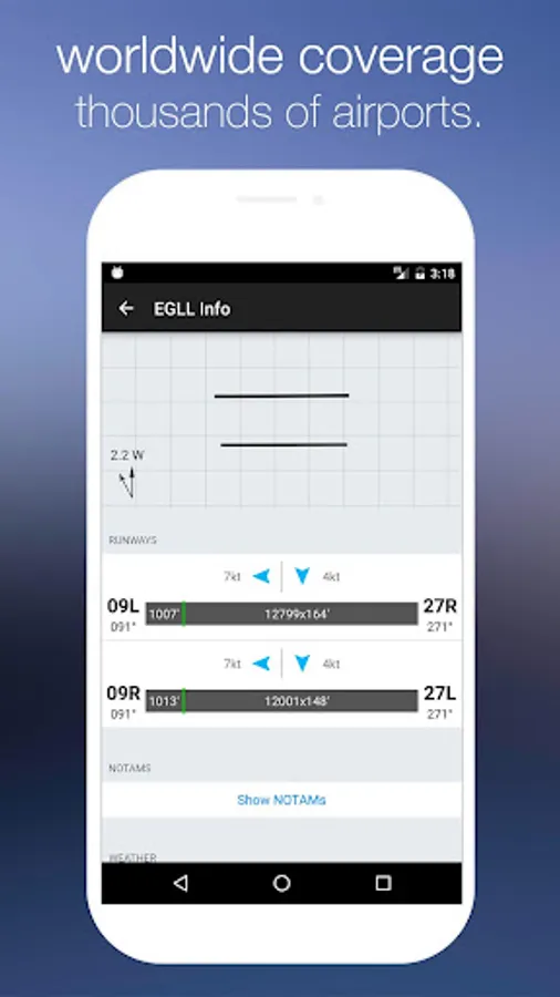 Wind is always displayed in combination with the airport's runways, allowing you to instantly get more context to the weather report.