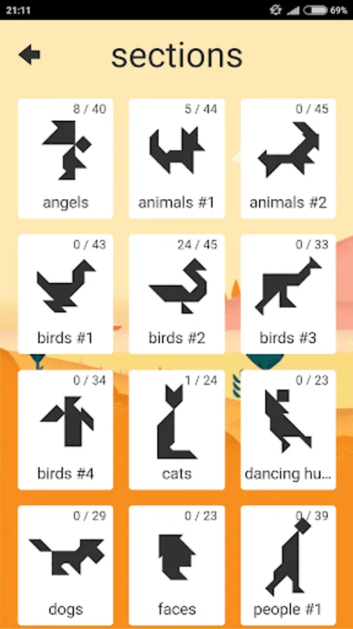 Right now the application contains 1001 tasks, split to sections. 9 beautiful textures for tangram and two game modes - simple and hard obviously.