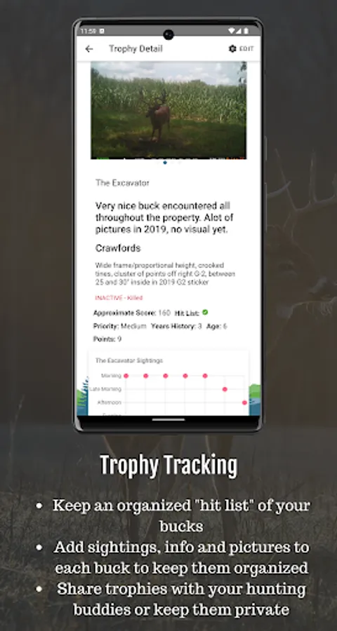 Store private, detailed records on trophy animals you are pursuing and share these records with other users that are pursuing the same trophy.