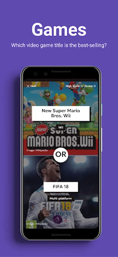 Fun higher or lower trivia stats games on a wide range of subjects including Movies, Google, Music, Geography, Football, NBA and many more.