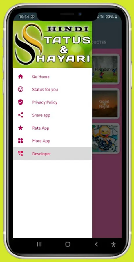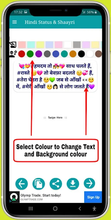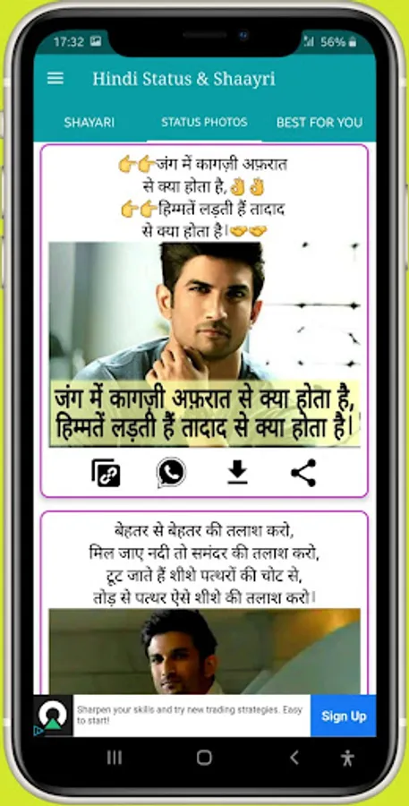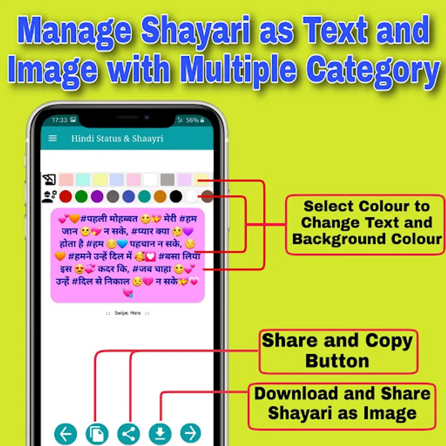 Here you can get latest hindi shayari ans beautiful hindi status photos for your daily wishes. You can aslo edit and design your favorite shayari text different colour and background. One of the new good features also available here, you can also make and share your shayari as images. 'Hindi Shayari & Status photos' app is a totally free app and providing all service are free in the app.