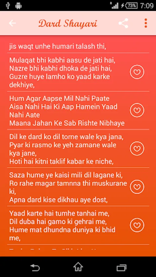 Enjoy the more collection of Dard Shayari (Hindi Messages) to share with your loved ones by whatsapp , facebook, SMS, email, Chats, etc. Click on the shayari and choose the app from the dialog through which you want to send the message. In this ◆Dard Shayari◆ app have lot of sad shayari . Express The Deepest Feelings Through Words. Shayari lets you explain sentiments in all their forms through rhythmic words. Dard Shayari Collection in Hindi and based on every emotion and theme. Shayari is unique poetic way to express yourself and express your feelings deep in heart. This app is the right place for Specially Dard Shayari on every Best in class categories like Dard bhari shayari, break up Shayari , Sad Shayari , bewafai shayri etc.