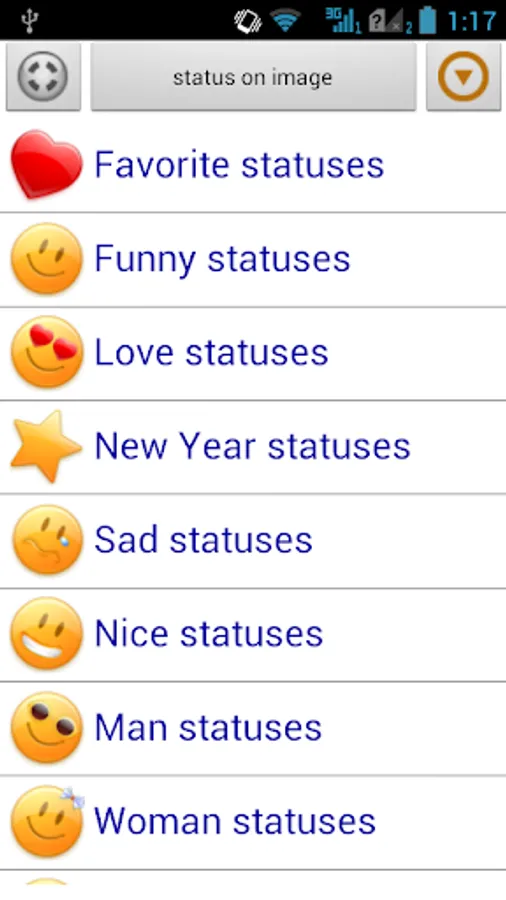 "Settings" – update statuses, sorting statuses in categories, set up the function "Status of the day", save/restore "Favorites" in Google Drive or SD-card and the ability to change the language of the application (Russian / English / Spanish / German / French / Italian / Portuguese).