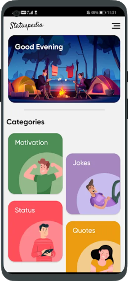 Statuspedia by Afterhours caters to all of your emotions like happy, sad, funny, attitude, motivation, love, cry, gym cheat, breakup, angry, stress, sorry.