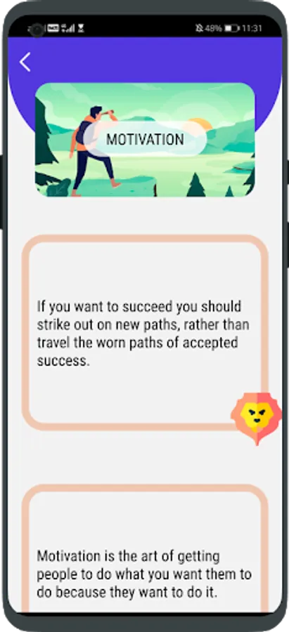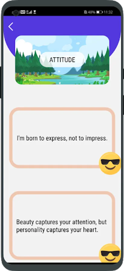 • Various categories of status/ quotes to choose from like, motivation, attitude, happy, sad, funny, heartbreak, cheating.