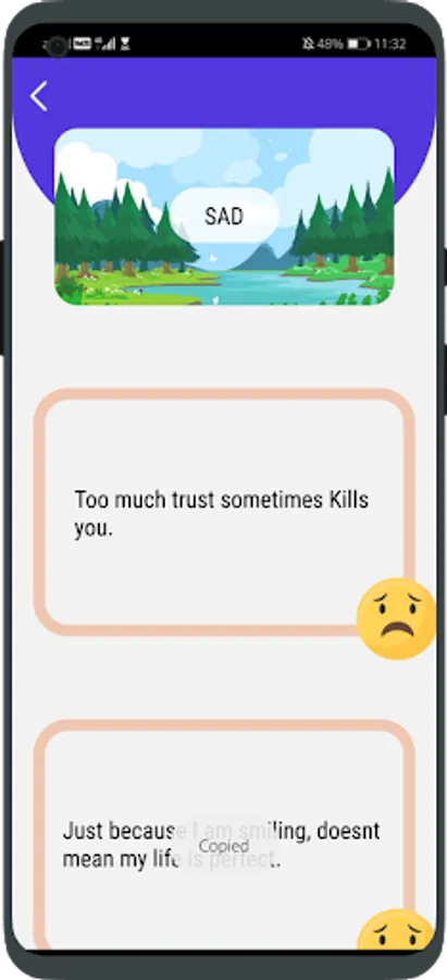 Each quote/ status comes with a copy button in the form of an emoji. Simply tap the emoji to copy the quote/status