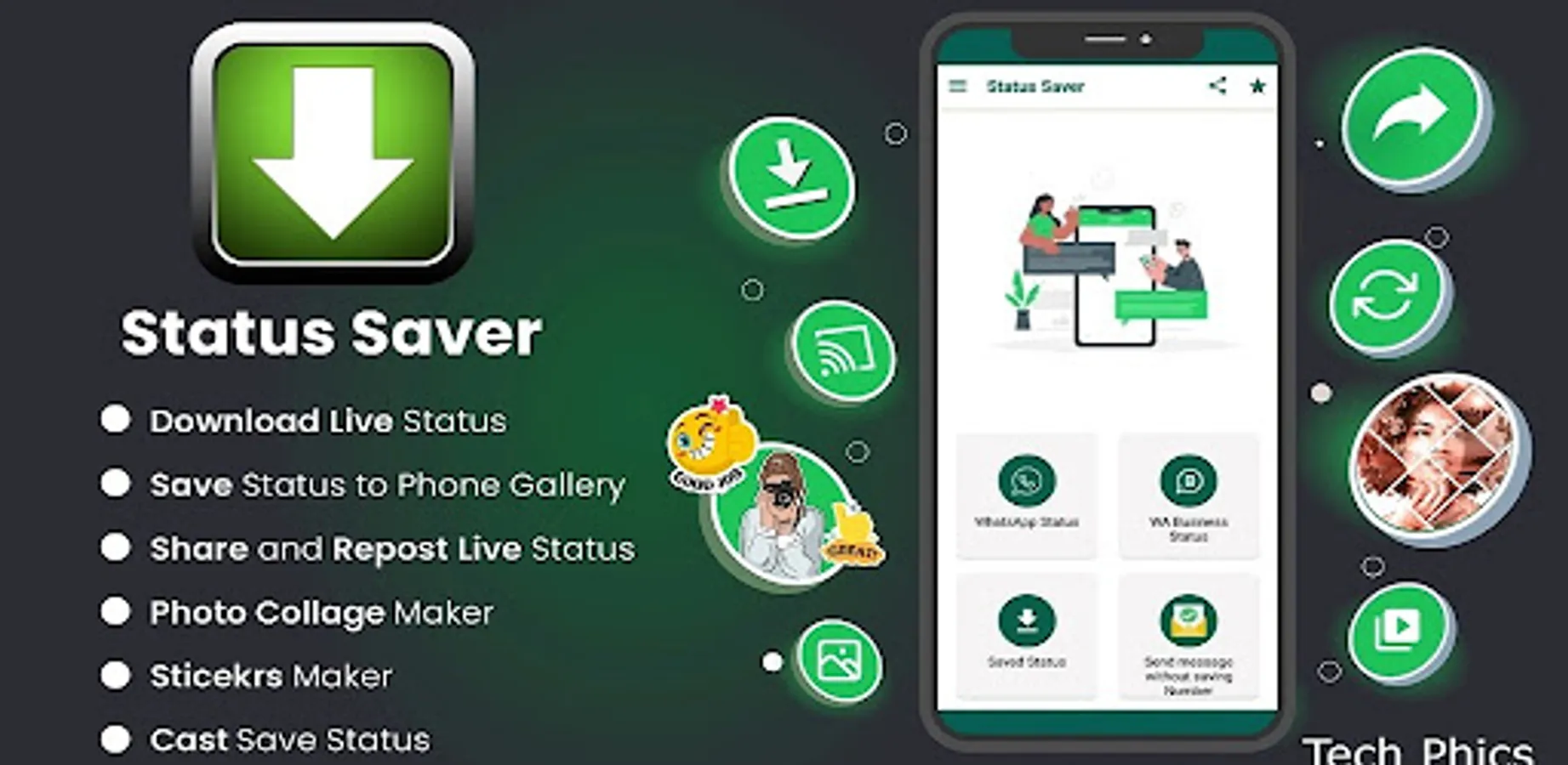 Status Saver:Status Downloader app lets you download photo images, GIF, Video of the new Status feature of WA Application and GB Version.Saved status & story saver also allows you to share media and repost Status from app to your friend with Video Saver.