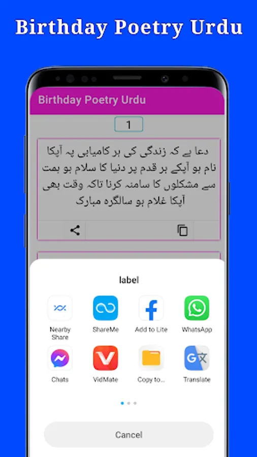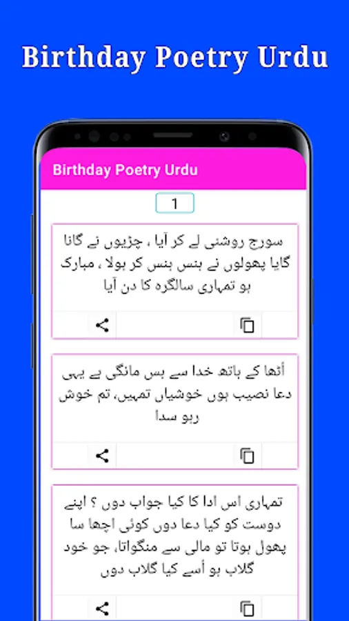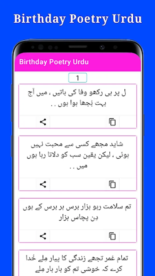 Happy Birthday Poetry In Urdu app is very easy to use interface just scroll up and down to read Urdu Happy Birthday Poetry and easily set that as your Whatsapp status or FB status. This app gives you the sad Whatsapp status in Urdu without any Internet connection.