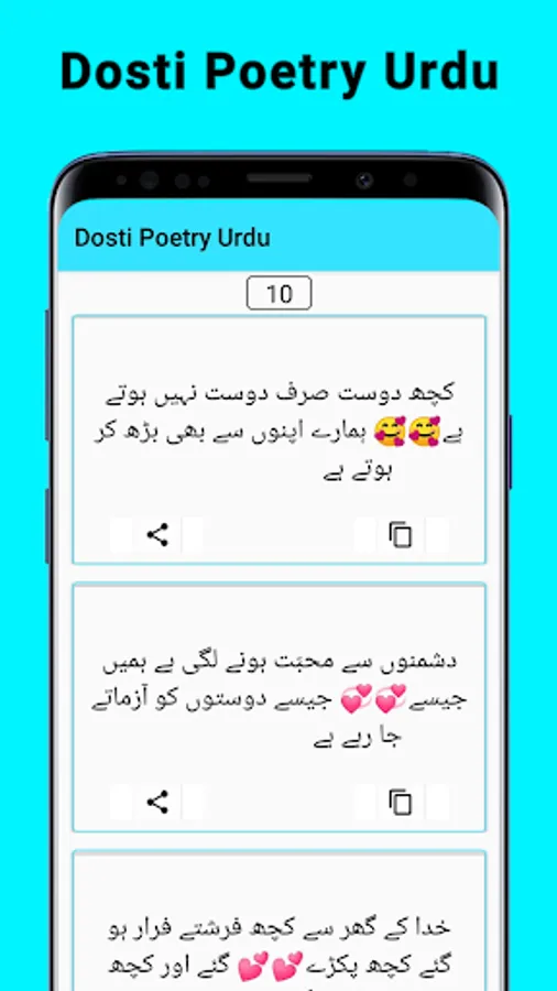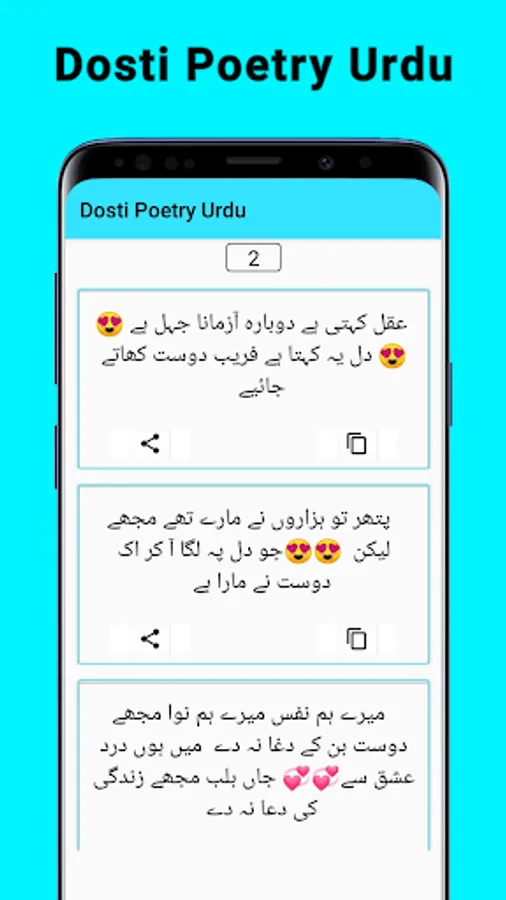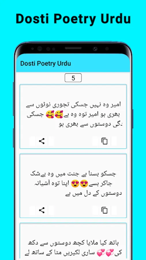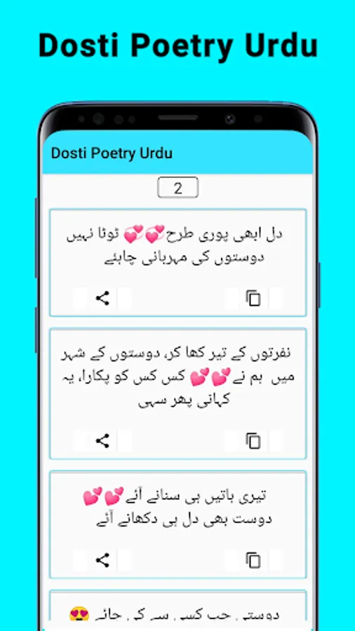 Dosti Poetry In Urdu app is very easy to use interface just scroll up and down to read Urdu Dosti Poetry and easily set that as your Whatsapp status or FB status. This app gives you the sad Whatsapp status in Urdu without any Internet connection.