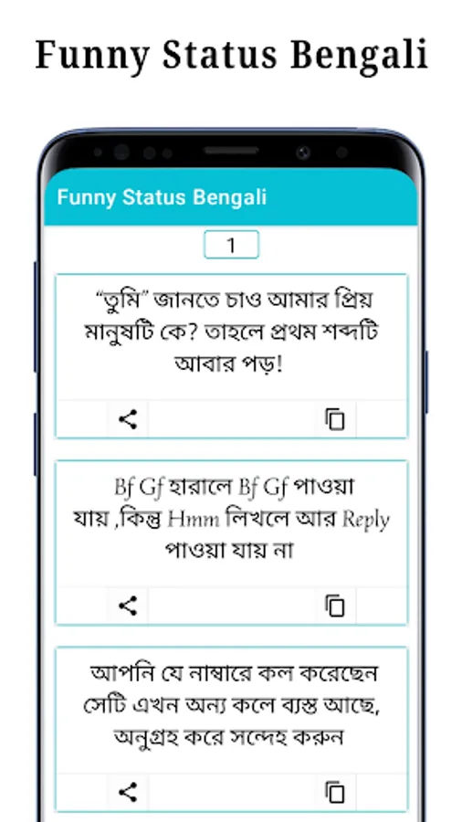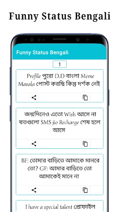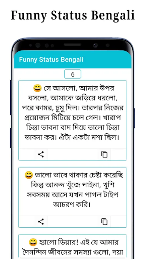 আপনি যদি কিছু মজার বাংলা স্ট্যাটাস কপি করে নিজেদের প্রিয় বন্ধুদের SMS হিসাবে পাঠিয়ে হাসতে চান অথবা Bangla funny captions কপি করে ফেসবুক অথবা ইনস্টাগ্রামে শেয়ার করতে চান তাহলে এই Funny Status Bengali অ্যাপটি আপনদের ভীষণ পছন্দ হবে। তবে আর দেরি না করে মজার স্ট্যাটাস পড়া যাক।