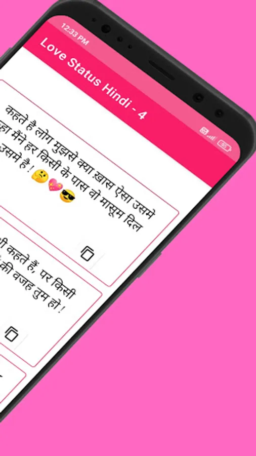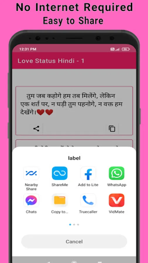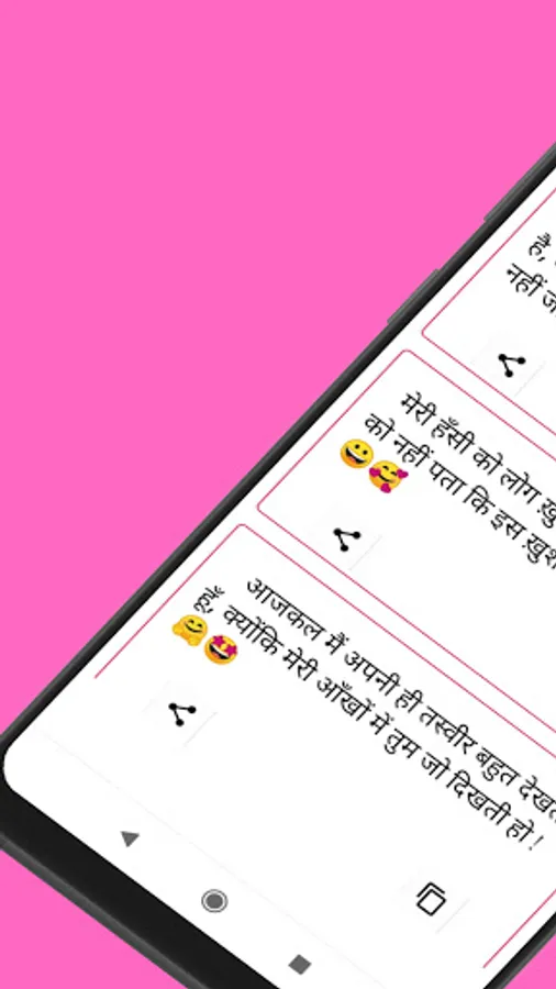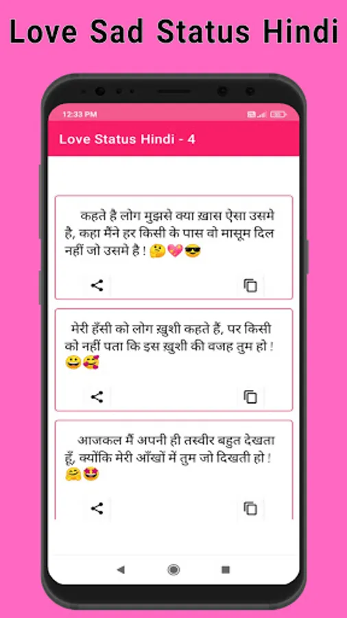 Love status In hindi app is very easy to use interface just scroll up and down to read Hindi Love status and easily set that as your Whatsapp status or FB status. This app gives you the sad Whatsapp status in Hindi without any Internet connection.