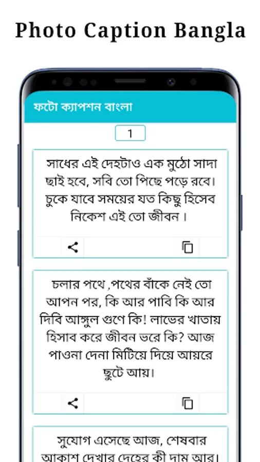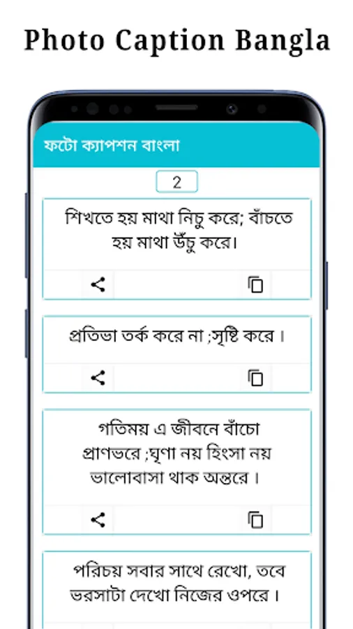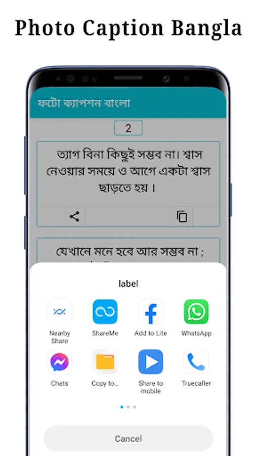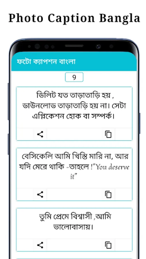 Photo Caption Bangla – আমরা এই App টিতে আপনাদের জন্য কিছু সেরা বাংলা ক্যাপশন নিয়ে এসেছি। বর্তমান সোশ্যাল মিডিয়ার যুগে প্রতি নিয়ত কেউ কিছু না কিছু FB ও Instagram এর মতন সোশ্যাল মিডিয়াতে শেয়ার করে চলেছে। অনেক সময় তারা তাদের উপলোডে করা ফোটোকে ব্যাখ্যা করার জন্য বিভিন্ন ধরণের bengali caption ইন্টারনের সন্ধান করে থাকে। সেই কারণে তাদের সুবিধার্থে কারণে এই App টিতে সমস্ত প্রকার বেস্ট বাংলা ক্যাপশন যেমন – bangla love caption, শর্ট বাংলা ক্যাপশন, attitude caption bangla, বেস্ট bengali caption for Fb, Instagram caption বাংলা, love sad bengali caption ইত্যাদি। এছাড়া কিছু বিশেষ কবিতা বাংলা ক্যাপশন ও প্রকৃতি নিয়ে ক্যাপশন এর সাথে প্রস্তুত করা হয়েছে যা আপনারা ইনস্টাগ্রাম ও ফেসবুক প্রোফাইল পিকচার এর ক্যাপশন দেওয়ার জন্য ব্যবহার করতে পারেন।