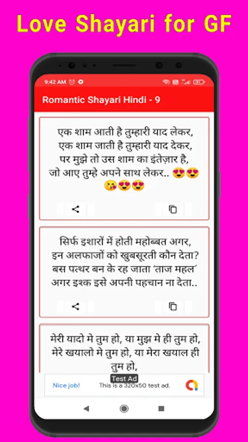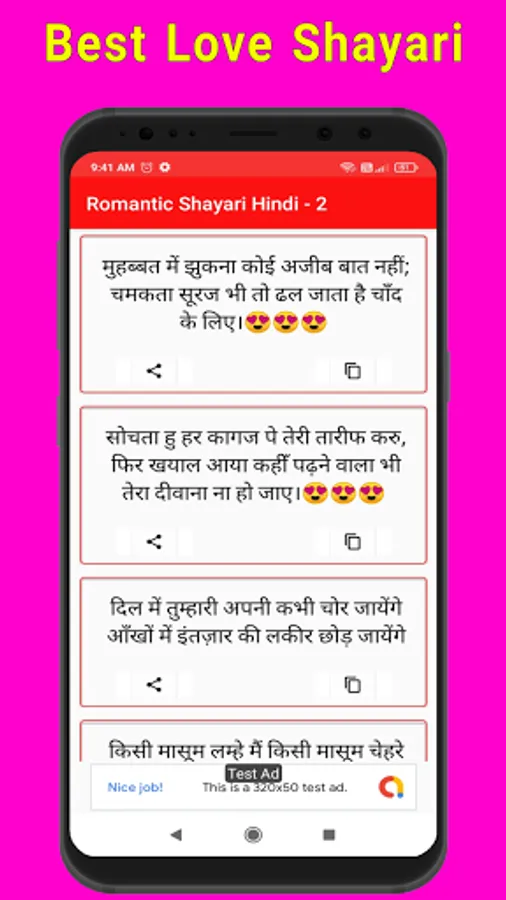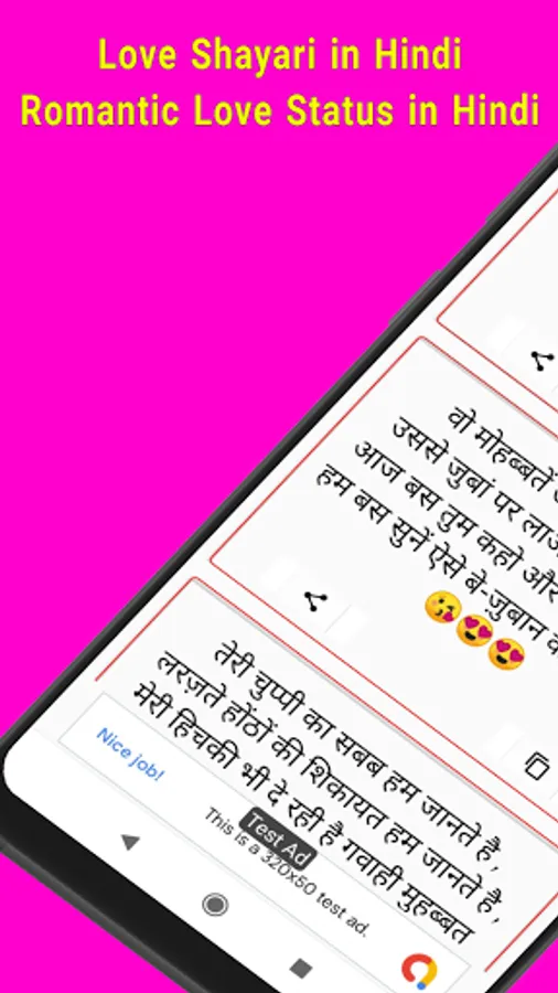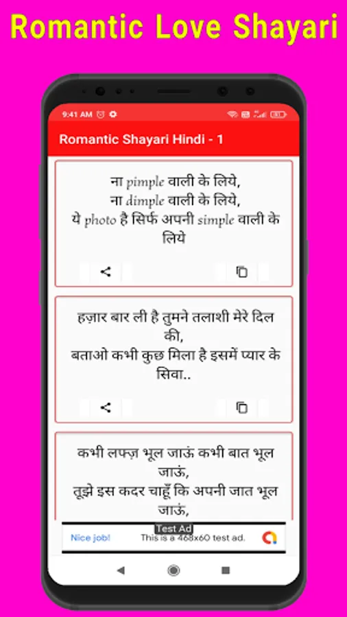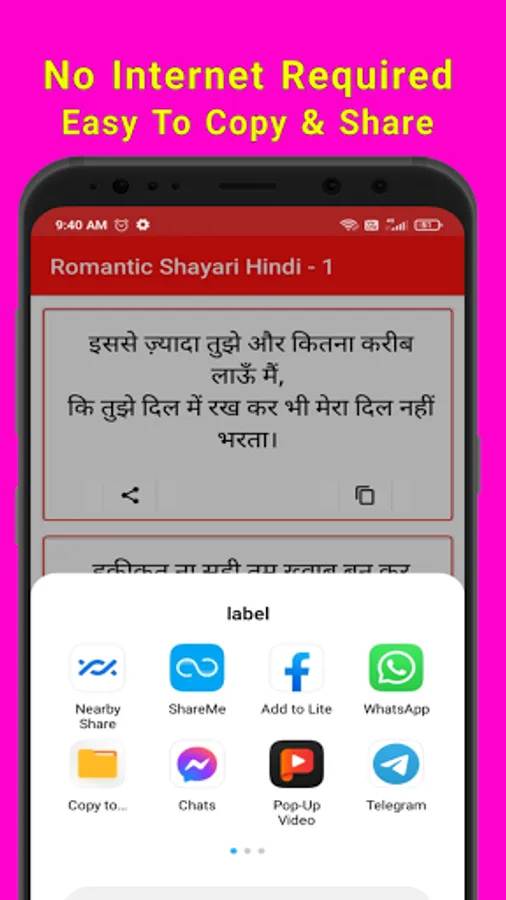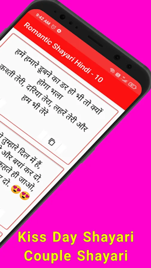 Romantic Shayari in Hindi app is very easy to use interface just scroll up and down to read Hindi Romantic Shayari and easily set that as your Whatsapp status or FB status. This app gives you the sad Whatsapp status in Hindi without any Internet connection.