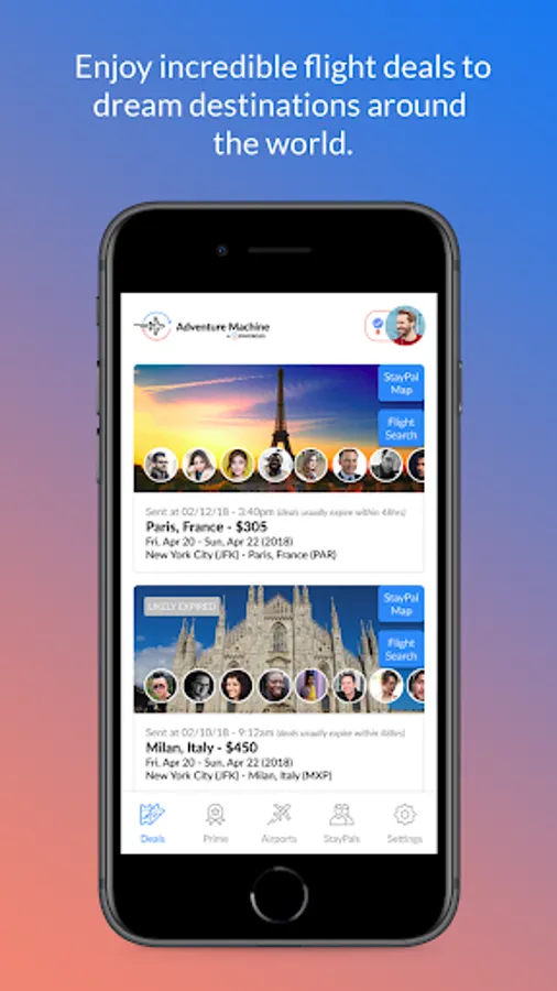 Saving up to 80% of the regular cost of flights means booking the flight before the airlines realizes their mistake or the less expensive ticket sell-out. Adventure Machine notifies you the moment our team has found an epic deals, so you can turn your dreams into reality for way way less. Even better, Adventure Machine is built on the StayCircles platform so you can easily see who your friends and friends-of-friends in the dream destination are to and plan fun or book free friendship stays.