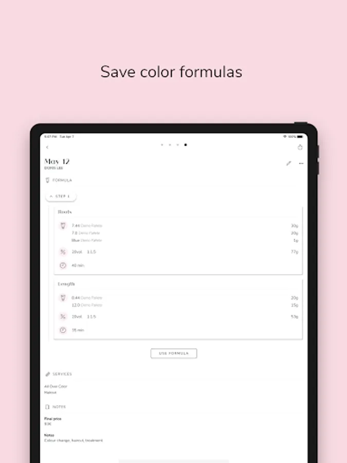 3. Create new hair color formulas during or after the client visit. Easily copy and edit formulas from previous visits. Everything is saved under the client profile