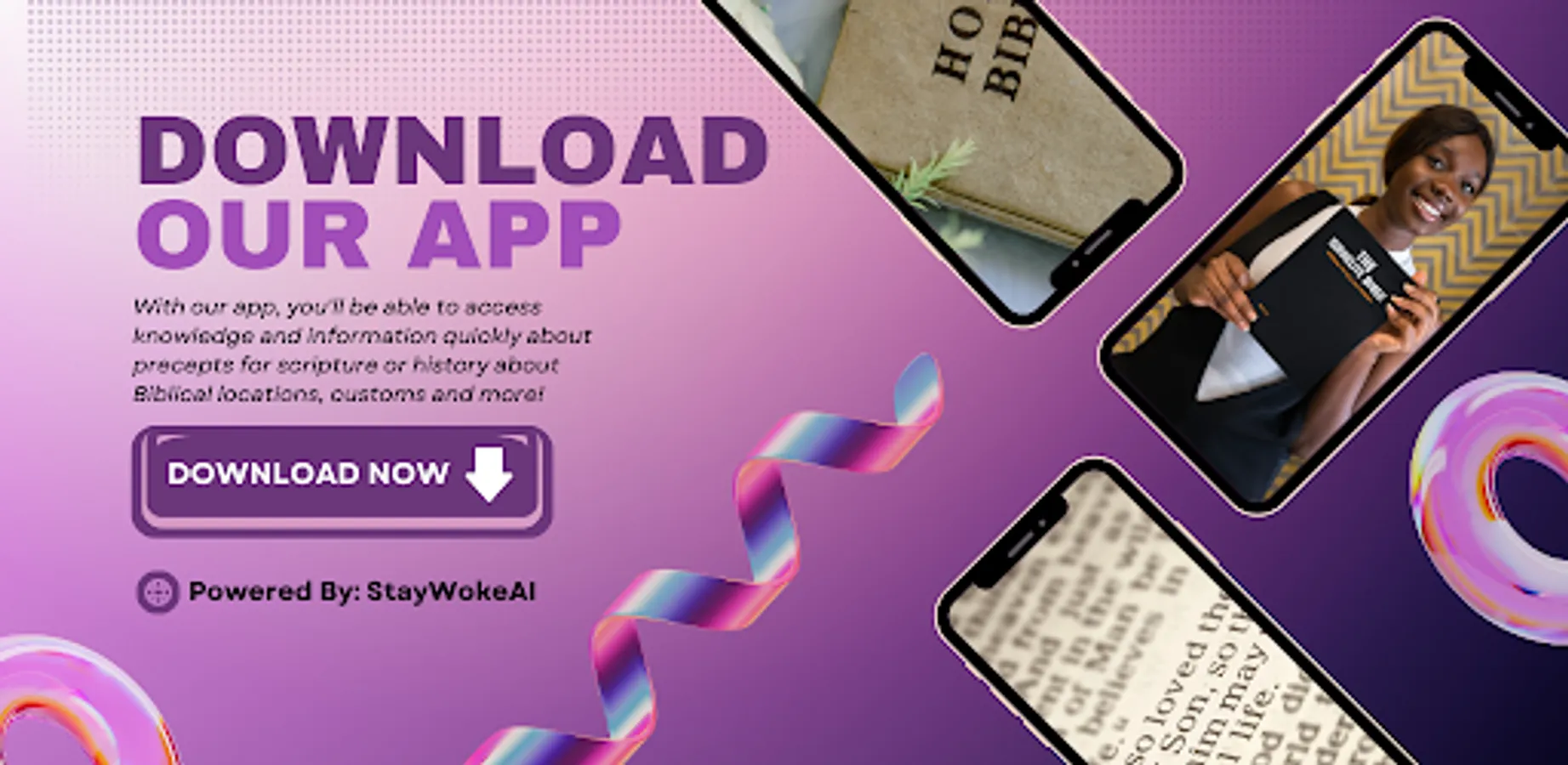 Discover a revolutionary way to deepen your biblical understanding and engage in meaningful spiritual exploration with the "AI Bible Study" app. Powered by StayWoke advanced artificial intelligence, this cutting-edge application combines the wisdom of scripture with the limitless potential of technology to provide an unparalleled Bible study experience.