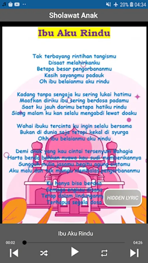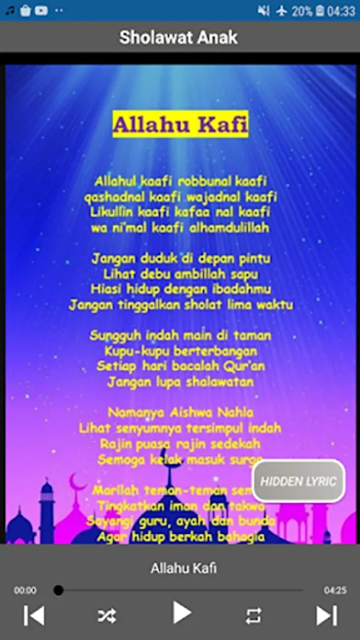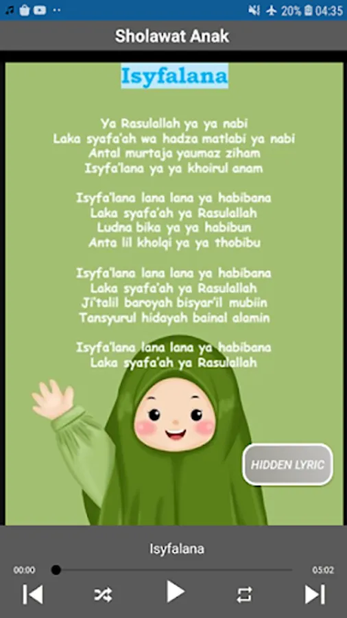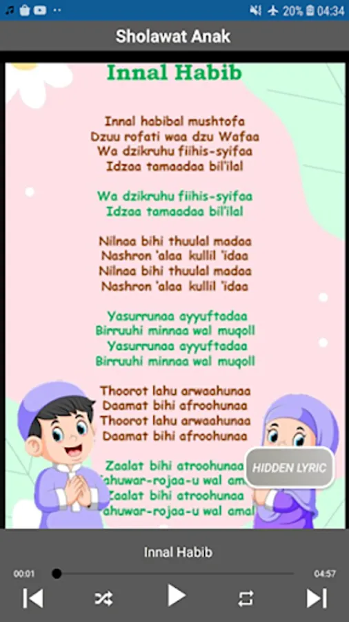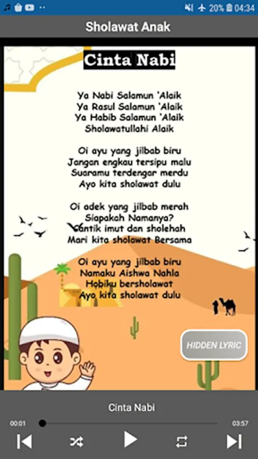 This complete offline Muslim children's song application displays various kinds of popular Muslim children's songs in high quality accompanied by song lyrics or subtitles. Muslim children's songs and the complete Prophet's prayer complete with the best HD quality MP3s suitable as educational songs for toddlers or kindergarten children.