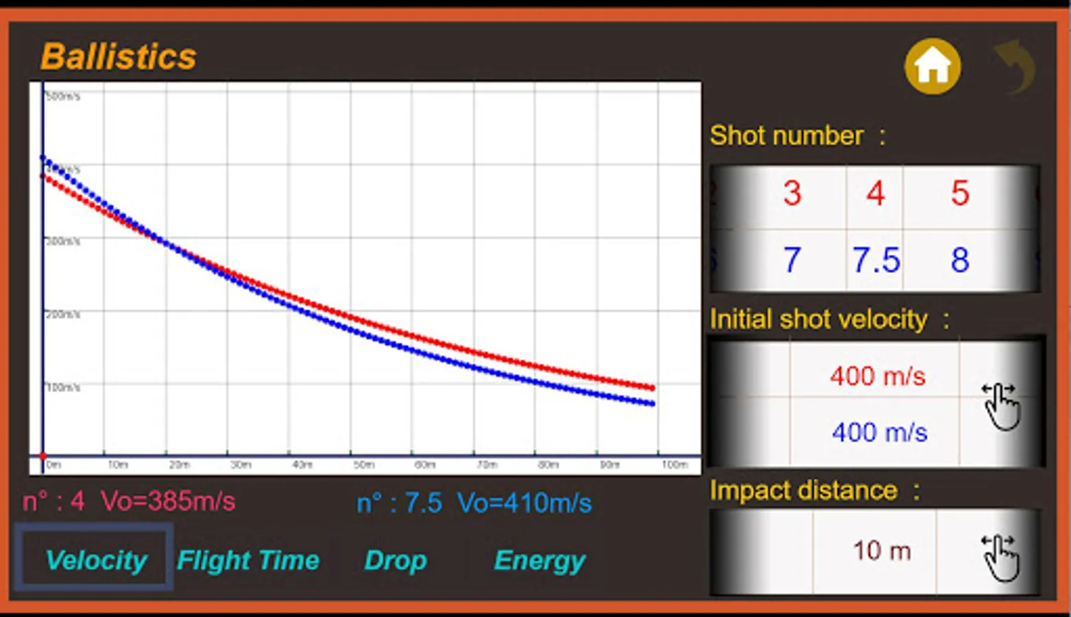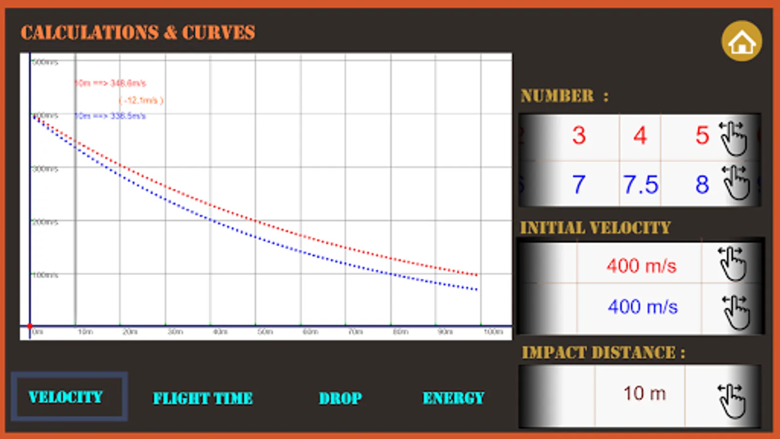 - Ballistic calculations: Speed, flight time, drop and energy;