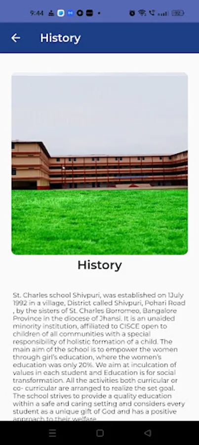 St. Charles school Shivpuri, was established on 1July 1992 in a village, District called Shivpuri, Pohari Road , by the sisters of St. Charles Borromeo, Bangalore Province in the diocese of Jhansi. It is an unaided minority institution, affiliated to CISCE open to children of all communities with a special responsibility of holistic formation of a child. The main aim of the school is to empower the women through girl’s education, where the women’s education was only 20%. We aim at inculcation of values in each student and Education is for social transformation. All the activities both curricular or co- curricular are arranged to realize the set goal. The school strives to provide a quality education within a safe and caring setting and considers every student as a unique gift of God and has a positive approach to their welfare.