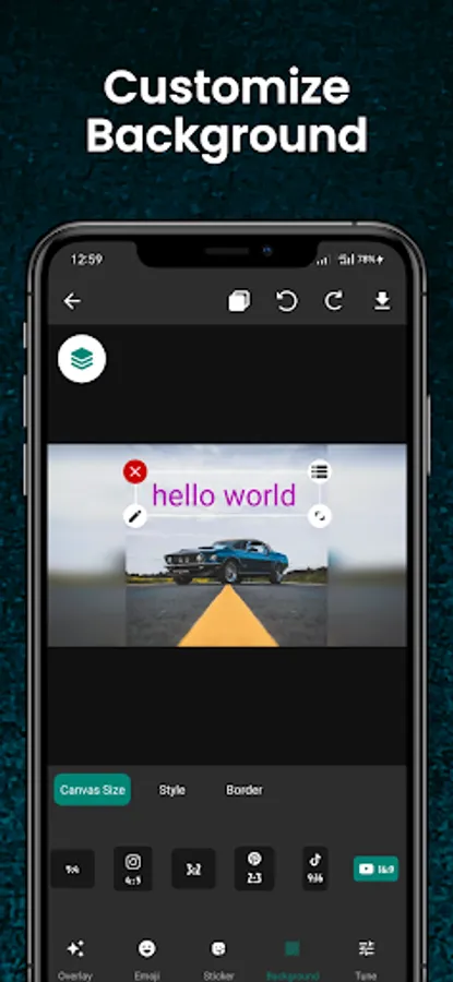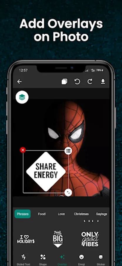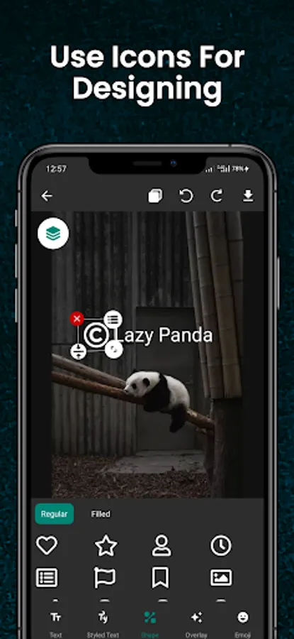 • Add different layers like icons, overlays, shapes, stickers, styled text.