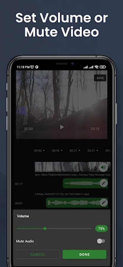 Pick a video file from your phone to remove audio from video. After picking the video, just tap the mute video option and it will start saving the result of removing audio from video as another video file. The app can remove sound from video within seconds. Remove audio from videos also reduce the size of the video file.