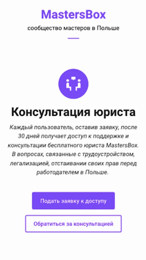 Using the MastersBox application, you can find a job, ask any question, find an answer, get free help from a lawyer, learn about upcoming events and get up-to-date information in this industry.