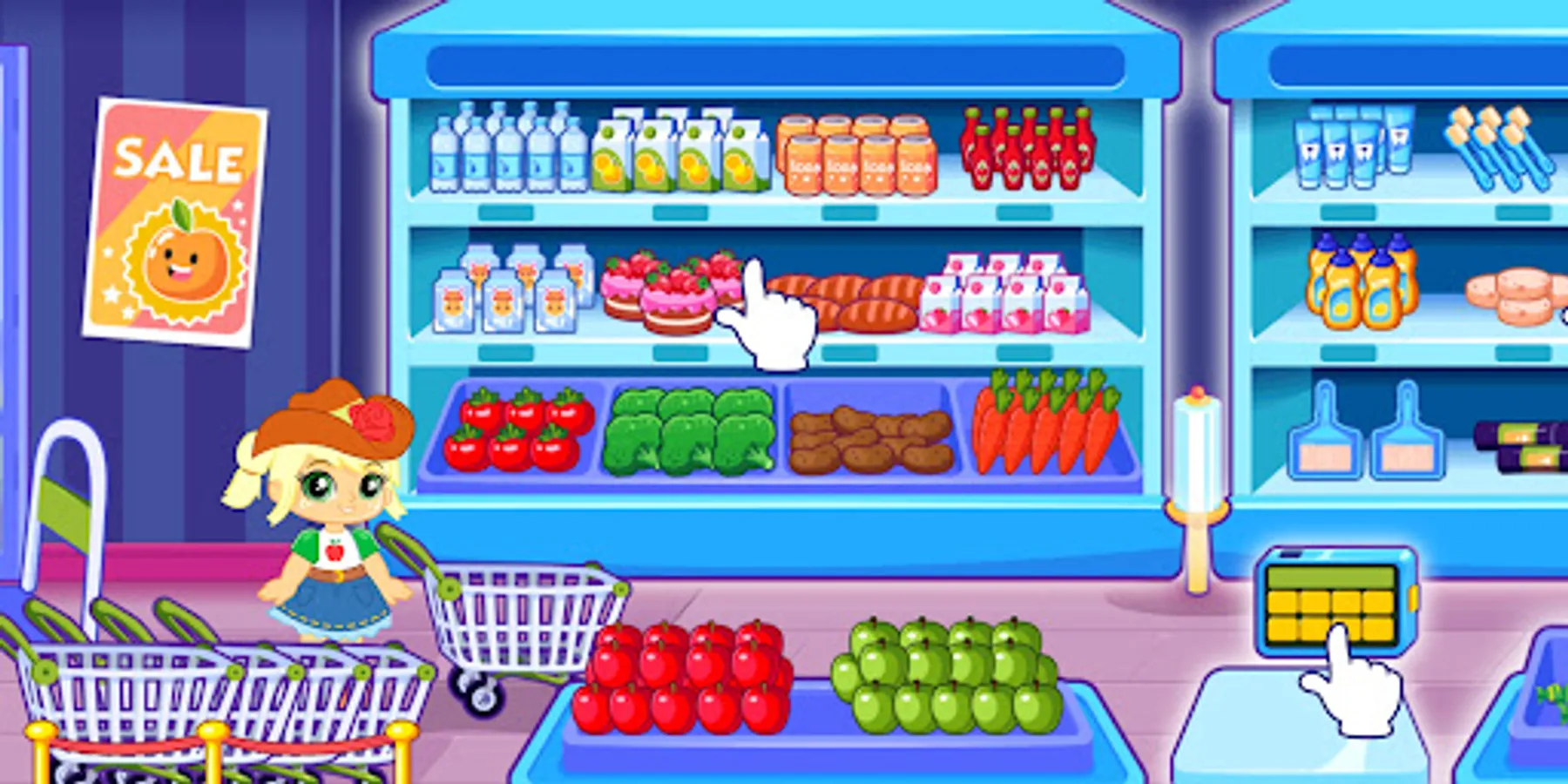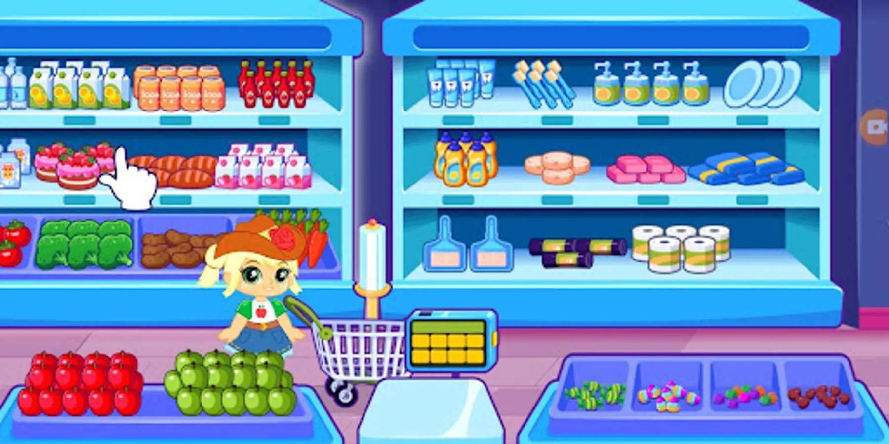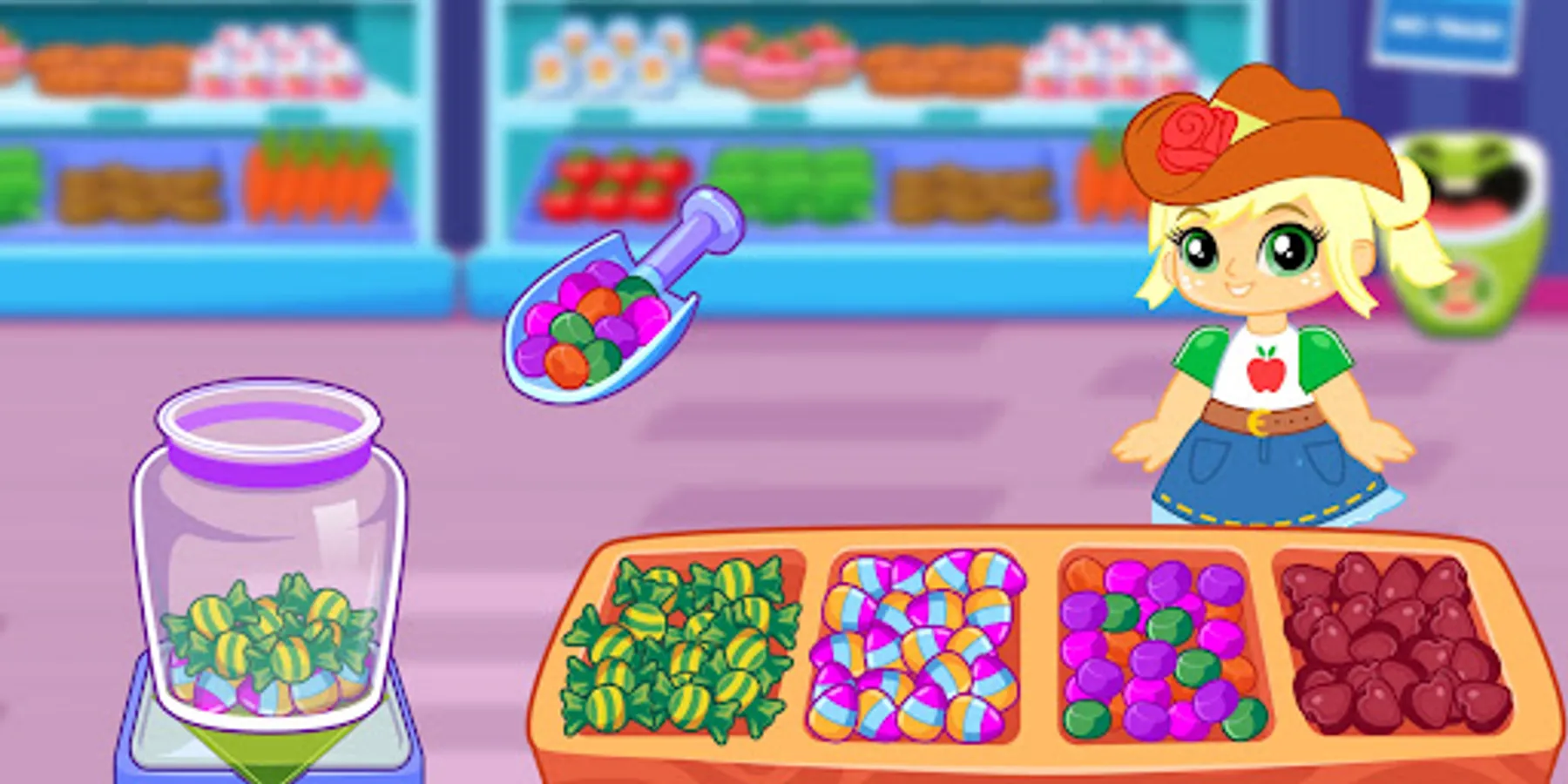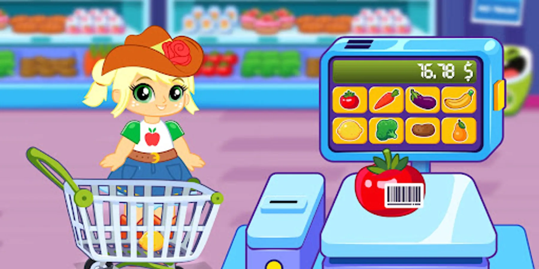 Fruits and vegetables: Pick up fresh fruits and vegetables, place them on the scales and click on the button with the correct image of the product, receive a price tag, and stick it onto the fruits and vegetables - now you are ready to put it in the mlp poni basket.