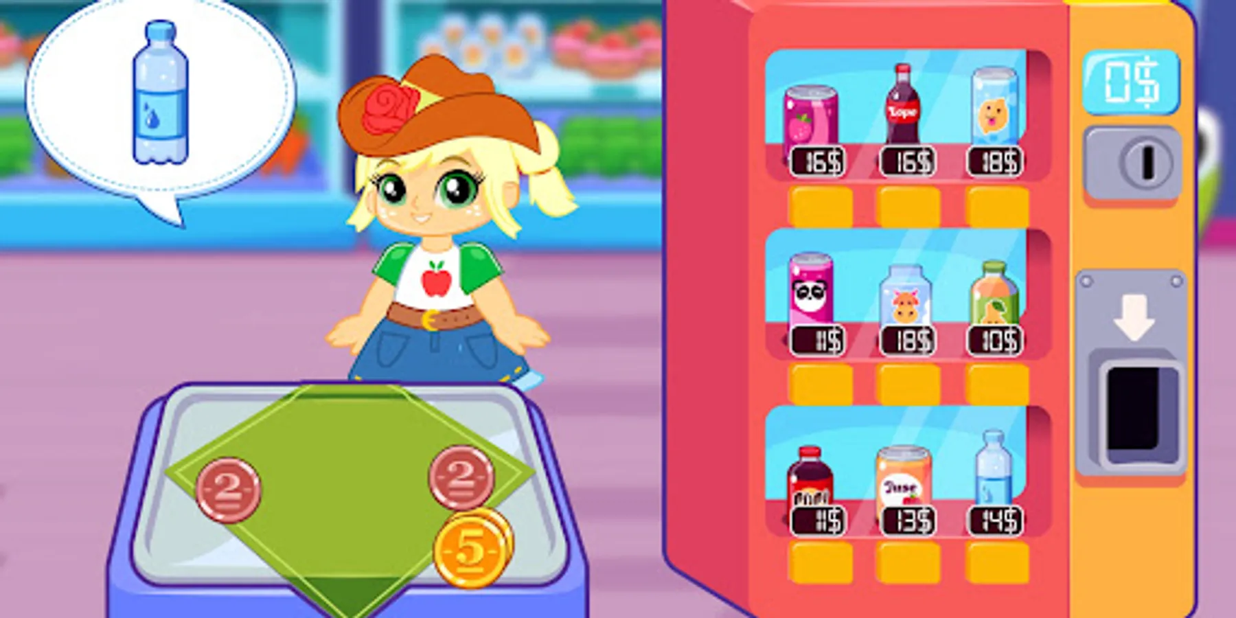 Drinks: This section of My Little Unicorn Shop is useful for pony lovers to learn how to use the drinks vending machine. Help the pony sisters and brothers to put the coins in the machine and click on the correct image of the drink: cola, juice, lemonade and many more.