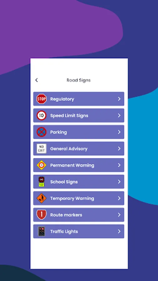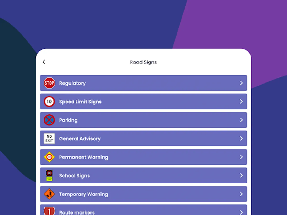 3. Road Signs – a full list of all relevant road signs, by categories.