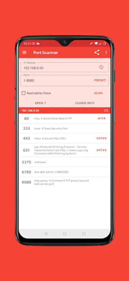 • Port Scanner: Probe any IP for open TCP ports with the added advantage of banner grabbing. Discover web services and let PortDroid suggest external applications for known protocols (ssh, telnet, http, https, ftp, smb etc.).