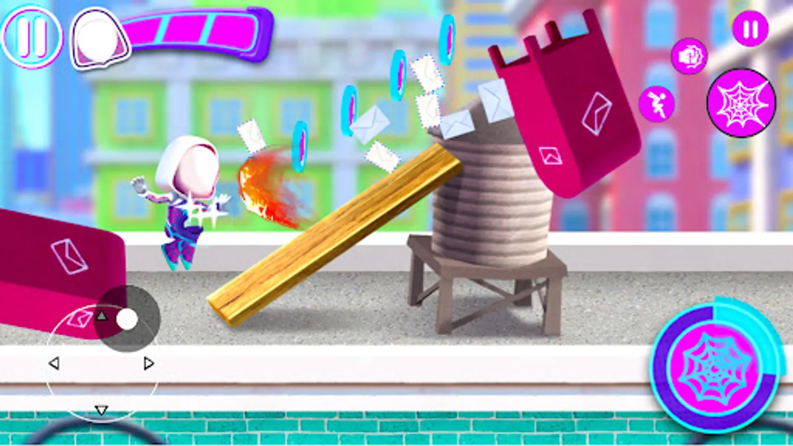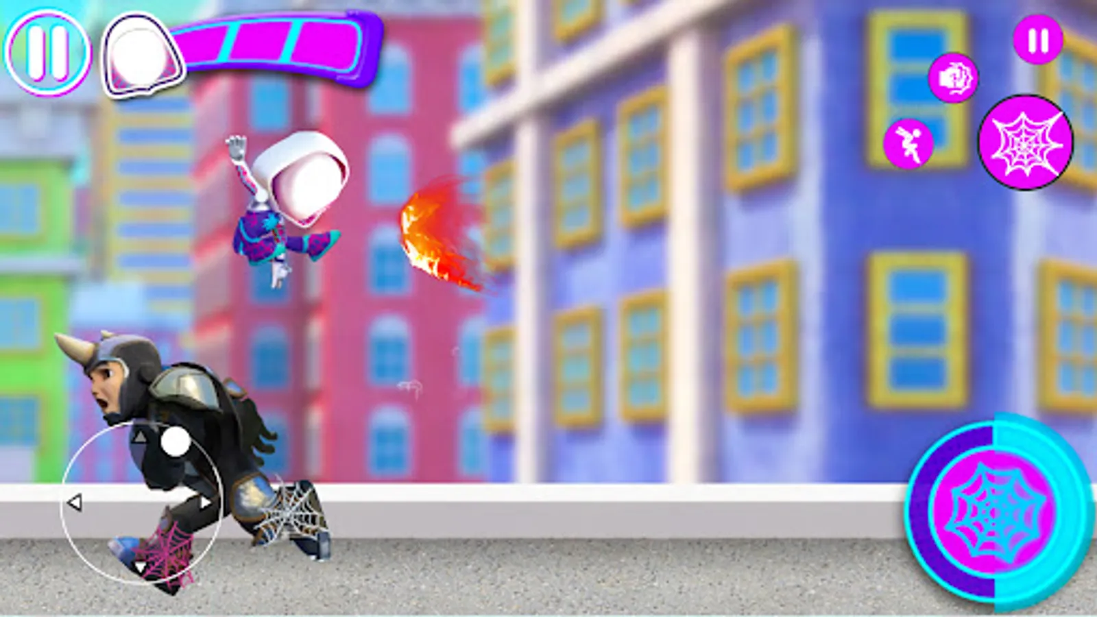 In this game you get to become three different heroes from the Spider-Verse, meaning Spidey, Spin, and Ghost-Spider, and with each of them, you go through missions where you have to challenge courses at the end of which you save cats, bicycles, or humans.