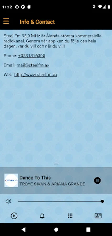 Steel Fm 95,9 MHz är Ålands största kommersiella radiostation. Vi spelar den nyaste musik blandat med de bästa hitsen från förr. Genom att ladda ner vår app så kan du lyssna på oss när du vill och var du vill. I samma app hittar du även Soft FM, en radiostation som är lite lugnare, och lite skönare.