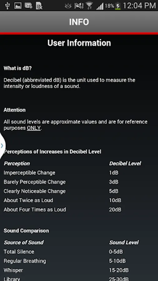 User information guide includes informative facts about sound perception and permissible noise level exposure as well as a sound level comparison reference chart.
