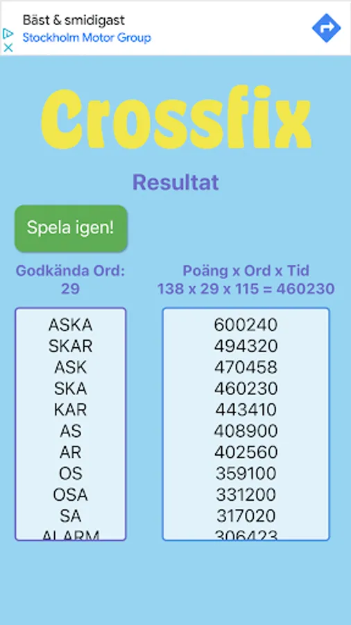 When you are satisfied filling out all words and letter (or anytime really) you press Done to have all letters and words checked with the dictionary. Your score is based on the letters included in the words, multiplied with number of validated words. This sum is then multiplied with the time left. EXAMPLE: If you write: CAMEL you get points for CAM, EL MEL etc. So you get points several words in one. Note that all Duplicates are removed before calculating is done!