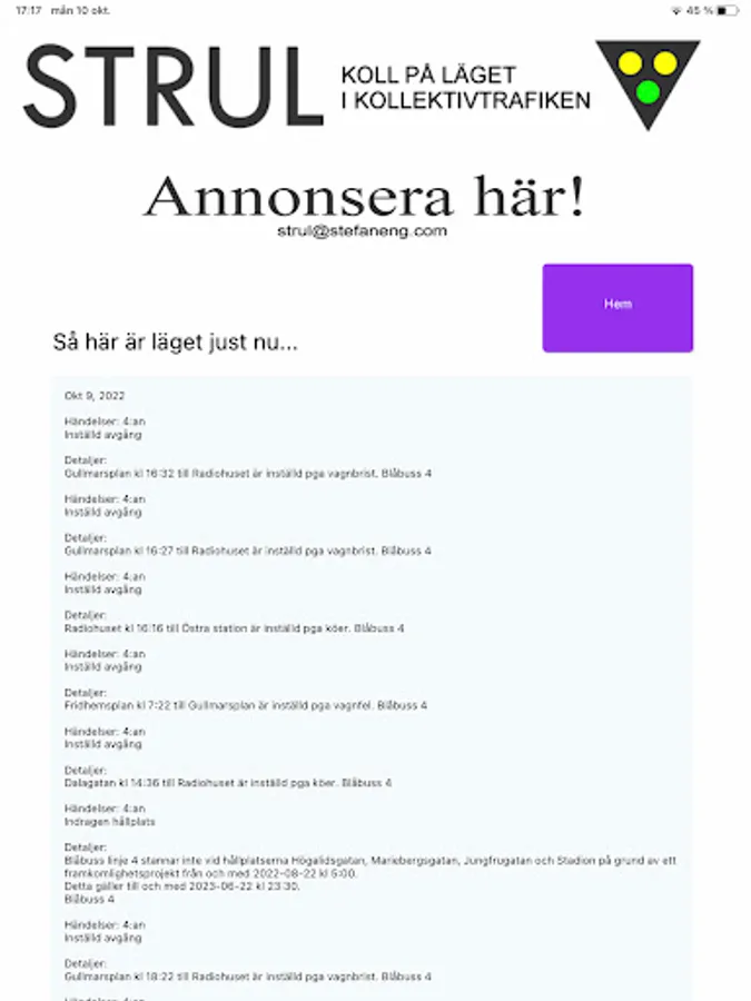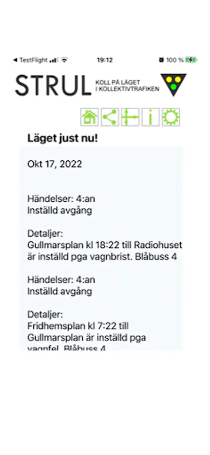 Already at the breakfast table, STRUL shows the current state of the city's public transport. With a simple click, you check your favorite line or several. (preselection means you don't have to click) Delays and canceled departures, moved bus stops or closed lifts. With STRUL, you get the latest information directly from SL.
