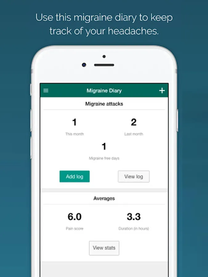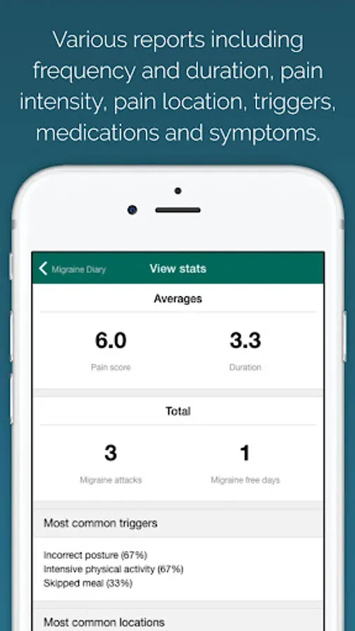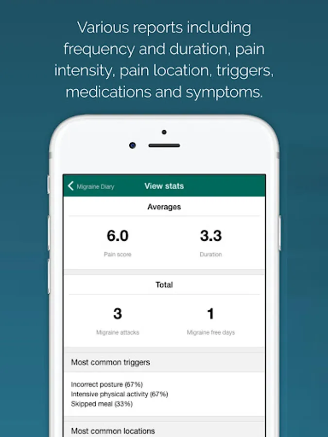 View statistics about your headaches like how many have been recorded (in total, this month & last month), how many "migraine free" days since your last migraine attack, the average pain score, average duration & the most common pain areas, triggers and medication.