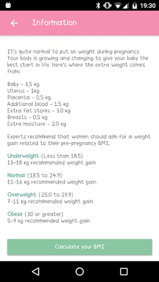 Experts recommend that women should aim for a weight gain related to their pre-pregnancy BMI. With our handy tool you can calculate your pre-pregnancy BMI. This tool will you give advice how much weight you may gain during your pregnancy.